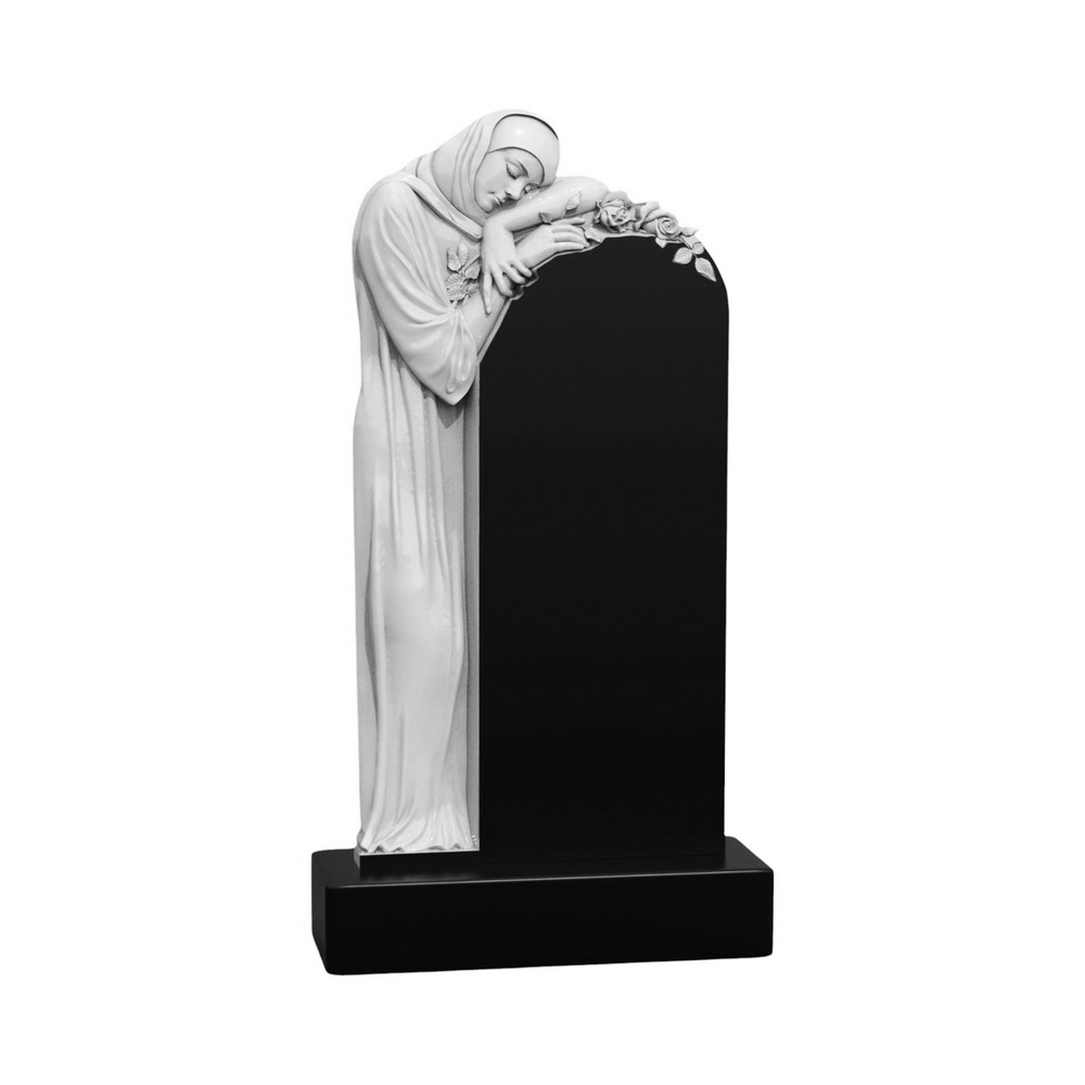 Фрезерная модель памятника со скорбящей, может быть выполнена из любой породы гранита и мрамора. Для большей детализации и объема требуется большая толщина камня. В комплект входит тумба (постамент) и цветник.